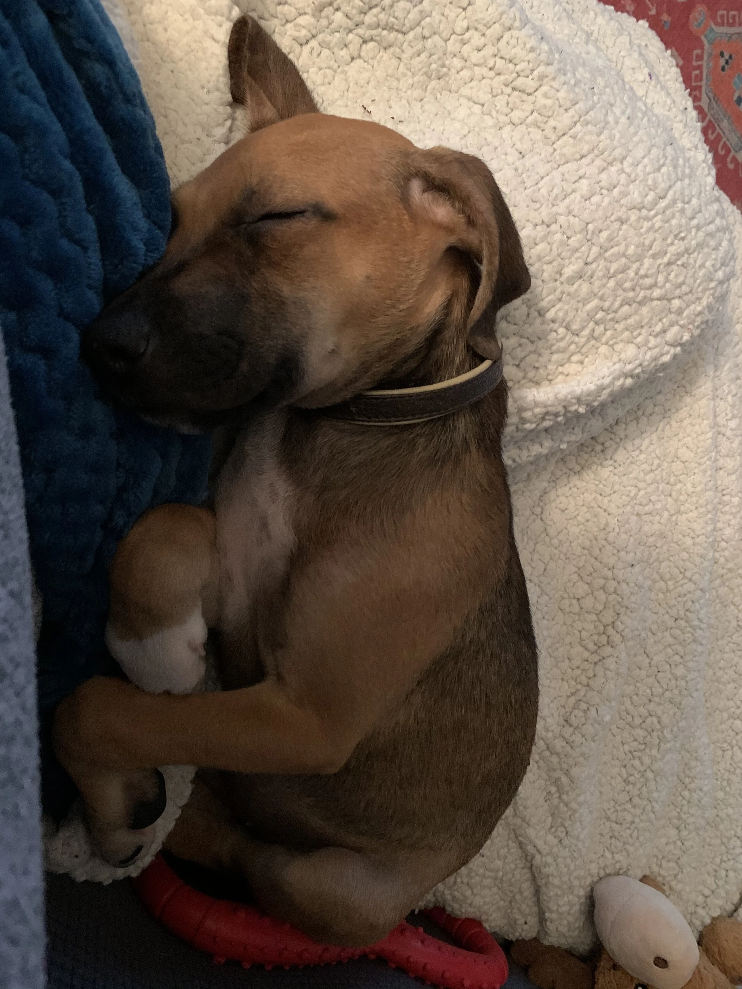 Walnut wakes up in his crate around 6 am to potty and get breakfast. He loves coming out of his crate in the morning to greet the other dogs and his humans. After breakfast and potty time, Walnut either plays with his doggie brothers, snuggles with mom, or grabs a chew toy. Because he's a young puppy, Walnut goes out for potty breaks every three hours or so during the day. He gets a snack around 3 pm and then eats dinner around 6pm. His day is filled with playtime, naps, snuggles with his doggie brothers, and potty breaks until bedtime around 9 pm. Walnut wakes up one time overnight to go out and potty. Otherwise, he stays quietly in his crate from 9pm-6am!
