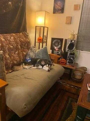 Wizzy is a great dog! He wants all your love and attention. He loves to meet new people, get pets, chew toys or bones, sleep on the couch, and snuggle with his humans. Surprisingly, Wizzy is quiet for a husky mix. He only seems to bark when he can see other dogs. He is house trained, but can still have some issues related to marking. These issues only seem to be present when exposed to other dogs in the home. He walks well on a leash and has enough energy to walk/jog in the morning (1+ miles). We trained him to heal on your right and that pulling on the leash means we stop. Wizzy knows the command to sit, wait to be released outside, and wait to be released from sitting and staying before eating (sit, stay). He doesn’t bolt immediately like an escape artist when a door opens. He is a very good car rider. Most of the time he sleeps on long drives, or just lays down quietly on shorter trips. Wizzy has been exposed to other dogs, and seems to have some food security issues with smaller dogs. He has not been exposed to other pets, but does show a strong prey drive, so rabbits and bunnies beware! Wizzy can be crated for the day if need be, but has been a model house guest with no accidents or destroying anything. Be sure to leave him with something to gnaw on as this alleviates this stress, as well as comfy bedding as he loves the plush; he likes to live in luxury! Wizzy has mild mobility issues which can make large jumps (such as into a couch or into a car) difficult for him. When Wizzy has to take his medication, we have found success in using pill pockets, hiding it in his wet food, and administering orally. Wizzy also loves belly rubs, and at times believes himself to be small enough to be a lap dog. He would love to spend an hour or two pressed up against your side on the couch. If you’re looking for a calm, low energy, snuggle buddy he’s your dog!